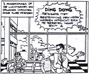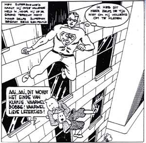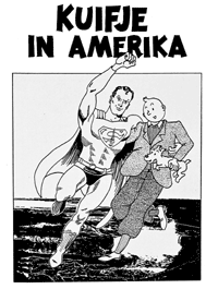 Ce Tintin en amérique (Kuifje in Amerika) vient des Pays Bas. Comme je ne parle pas hollandais...j 'ai demandé à un amateur de BD des pays bas de me parler de ce récit. L'histoire est assez sympa . Elle est liée à l'épisode lunaire d'Hergé. Que sont devenues les barbes qui poussent sans arrêt des Dupont&d ? Elles sont dans l'espace ! Bref Tintin jeune reporter se retrouve aux USA avec d'autres reporters .... comme Clark Kent ou Superman ! Dans le monde de la parodie, Tintin était déjà confronté à Batman, il ne manquait plus que le super héros planétaire ! Le journaliste vertueux aux pouvoirs "Kriptoniques" devait rencontrer un jour le non moins célèbre reporter belge élevé à la bonne vieille frite de Bruxelles !! Ce récit n'est en aucun cas un oeuvre underground mais bien une parodie LEGALE ! C'est Bert Bruynooghe le fils de l'auteur, Wim Bruynooghe, qui nous a donné cette information : "Le bouquin est le résultat d'un concours du magazine "Kuifje" pour l'école Onze Lieve Vrouw ter Engelen" à Courtrai, Belgique. Le question final était: créez un nouveau album "Kuifje en Amerique". Donc le bouquin était fait rapidement avec des anciens albums de Tintin, Petit Vingtième et Superman avec une vieille machine à copier. Ils ont gagné le premier prix: un voyage en Amerique, New York."...